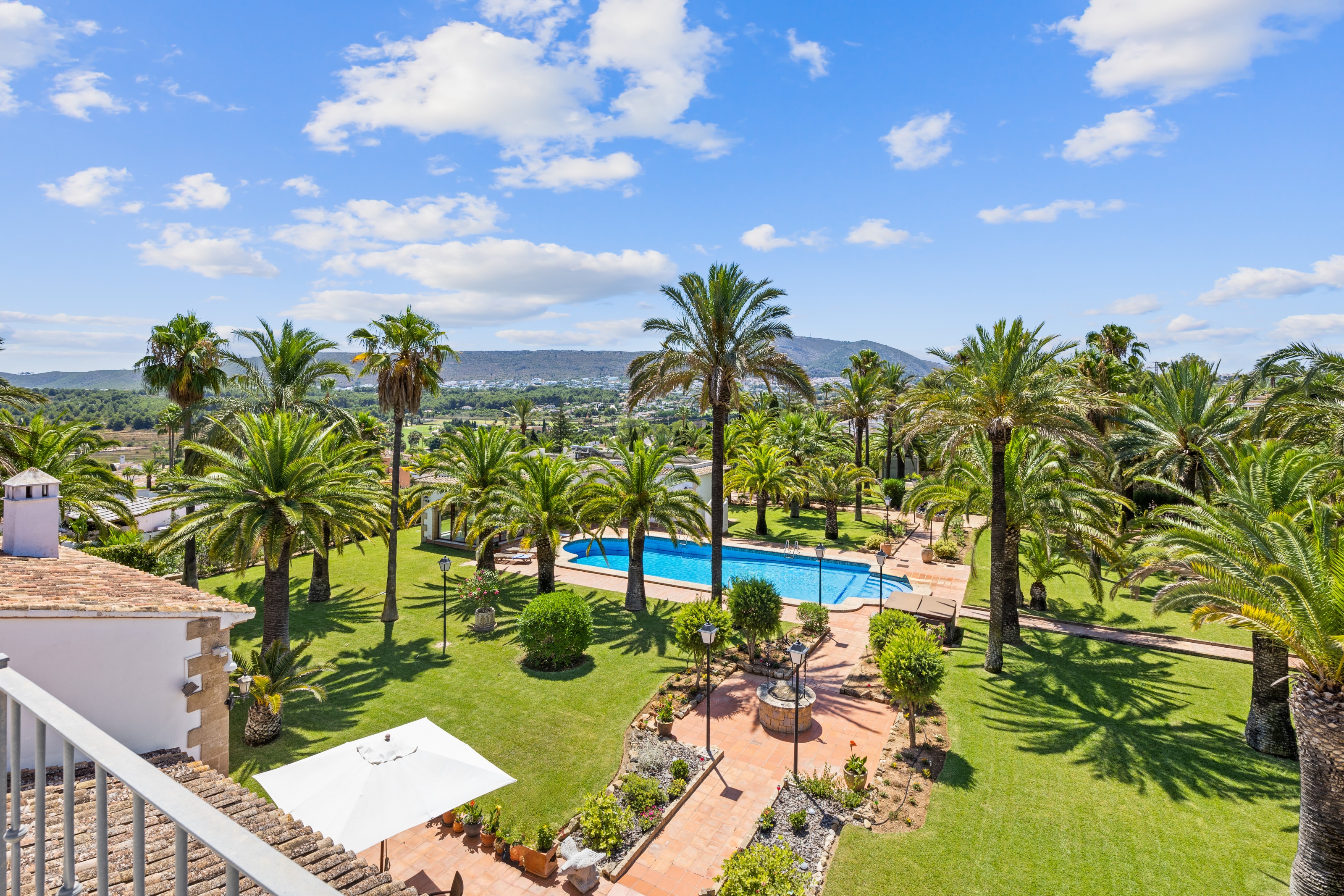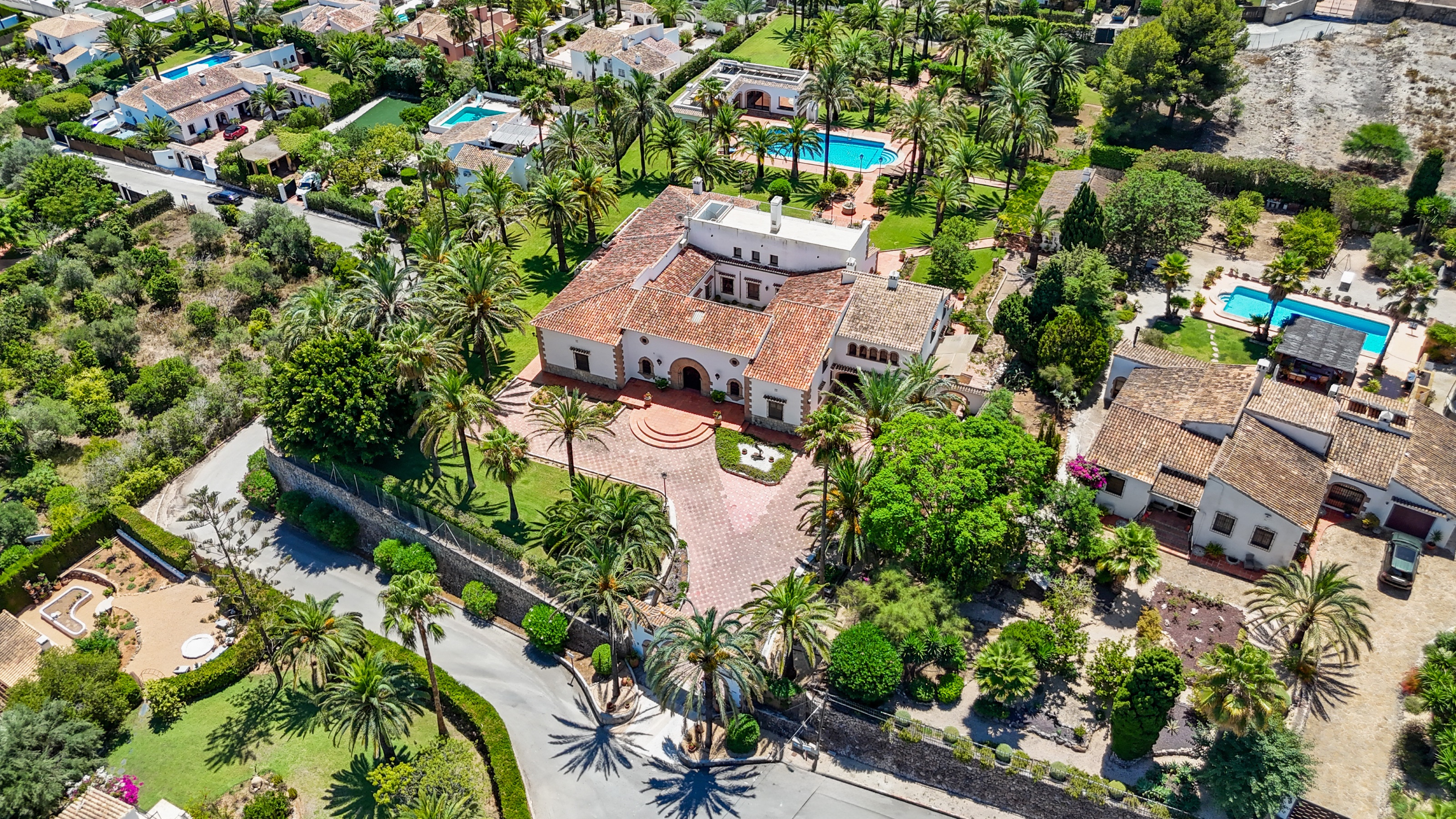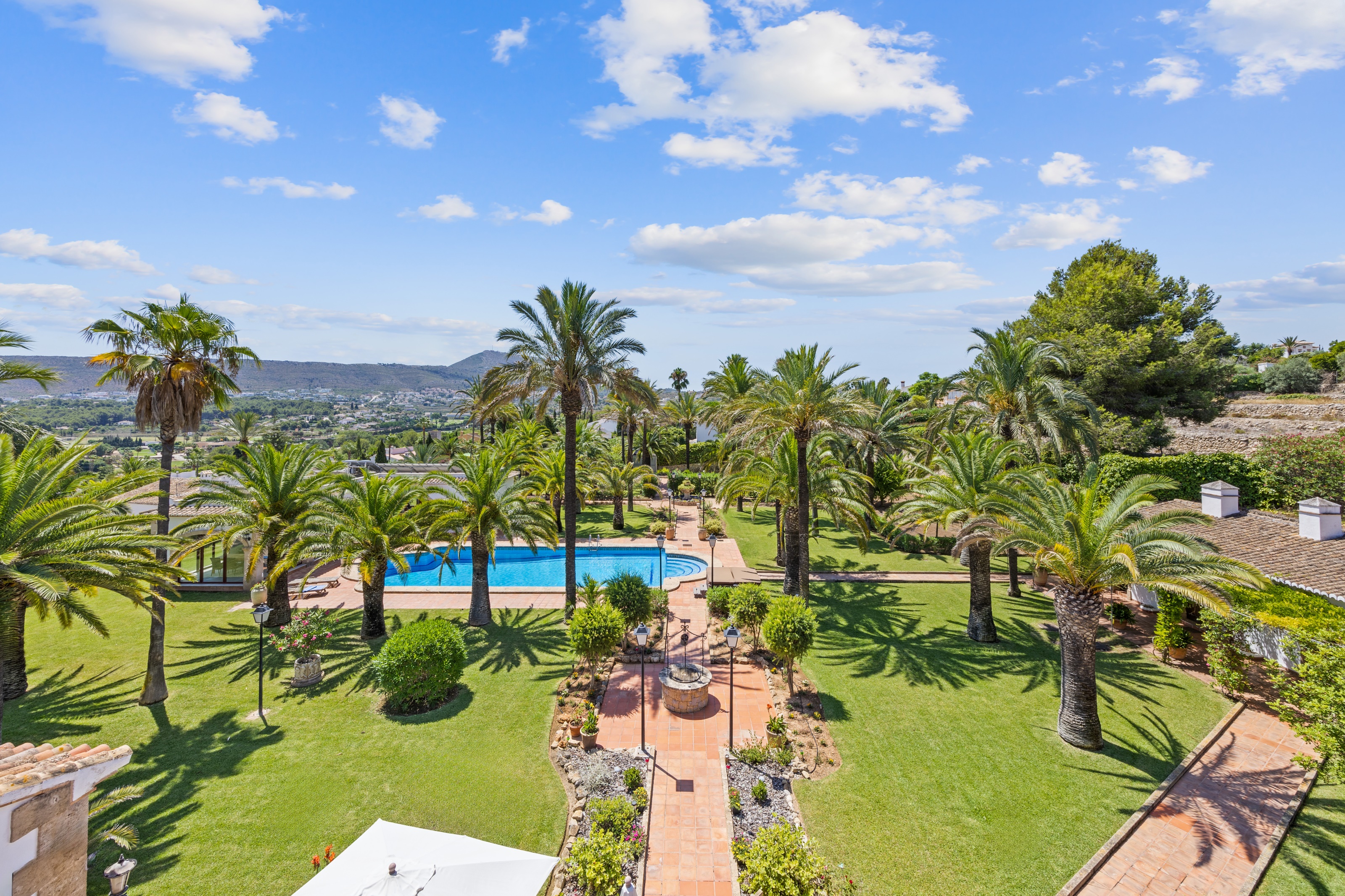 À l’extérieur, les vastes jardins paysagers comprennent plus de 80 palmiers, une piscine privée de 16 × 7 mètres et plusieurs terrasses conçues pour profiter du microclimat exceptionnel de Jávea toute l’année. Un puits privé permet l’irrigation à travers le domaine, une touche pratique pour des terrains aussi vastes.