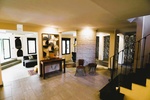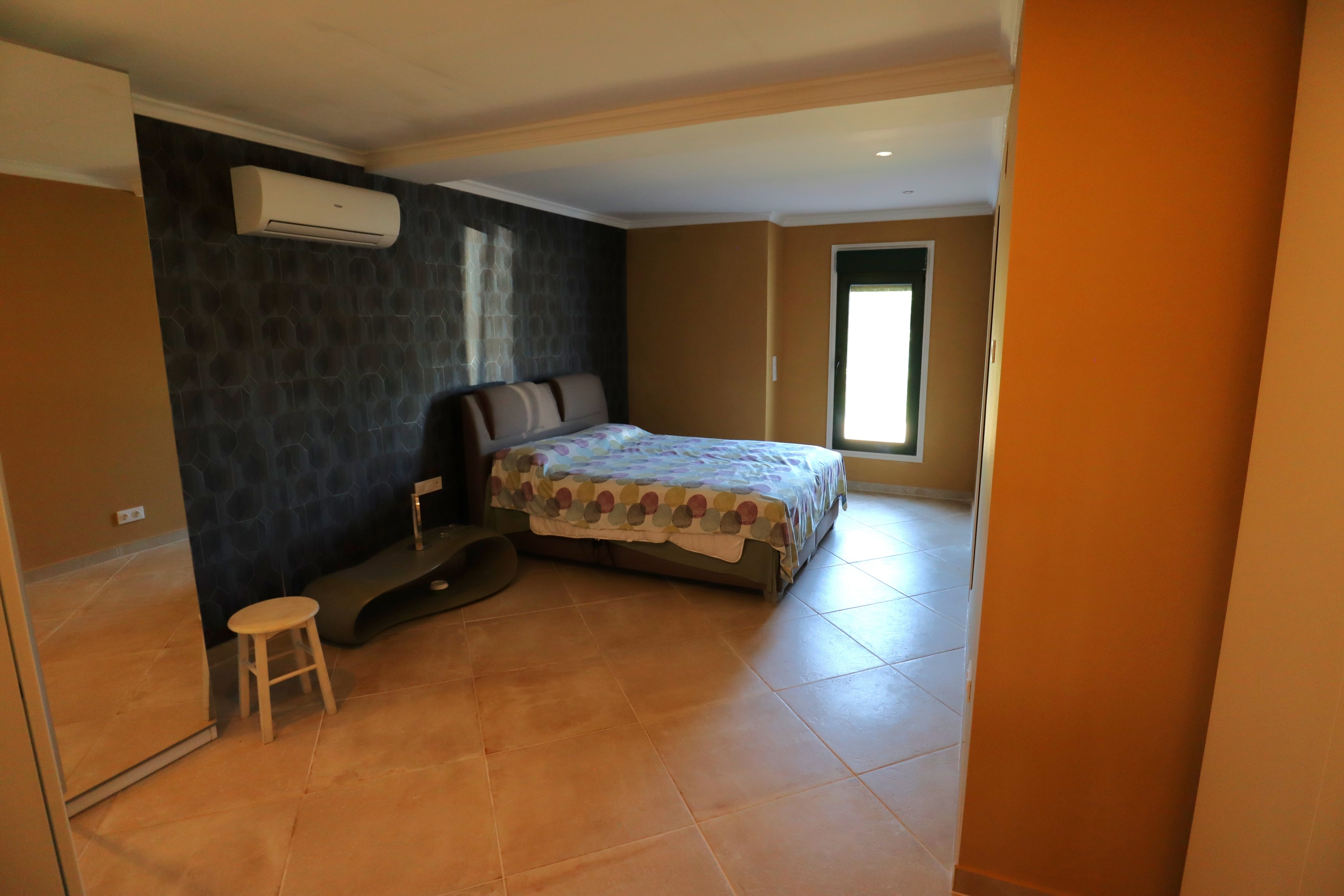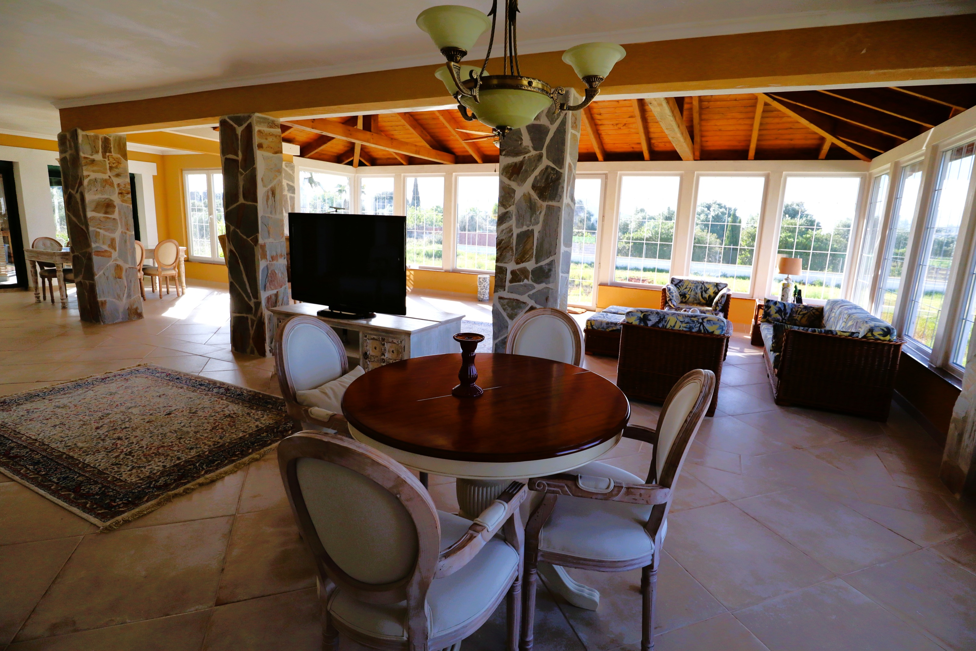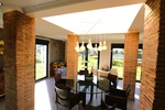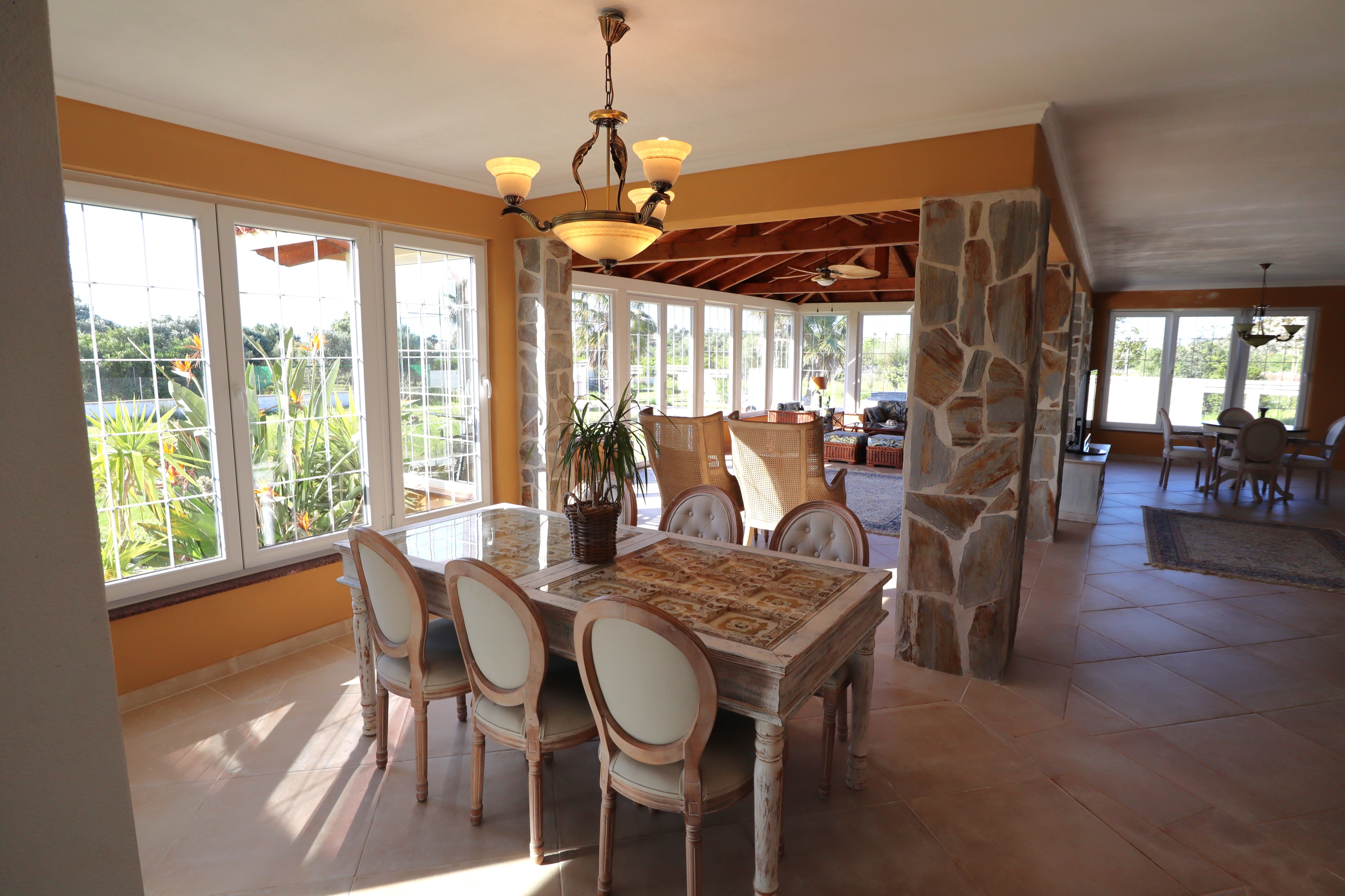 À l’intérieur, la maison est tout aussi adaptée à un mode de vie flexible. Le rez-de-chaussée comprend un hall d’entrée accueillant, un salon douillet avec cheminée, une cuisine spacieuse avec îlot et bar, et une salle à manger lumineuse avec puits de lumière. Une ancienne naya a été fermée, créant un espace de vie et de salle à manger lumineux avec de grandes fenêtres donnant sur le terrain.