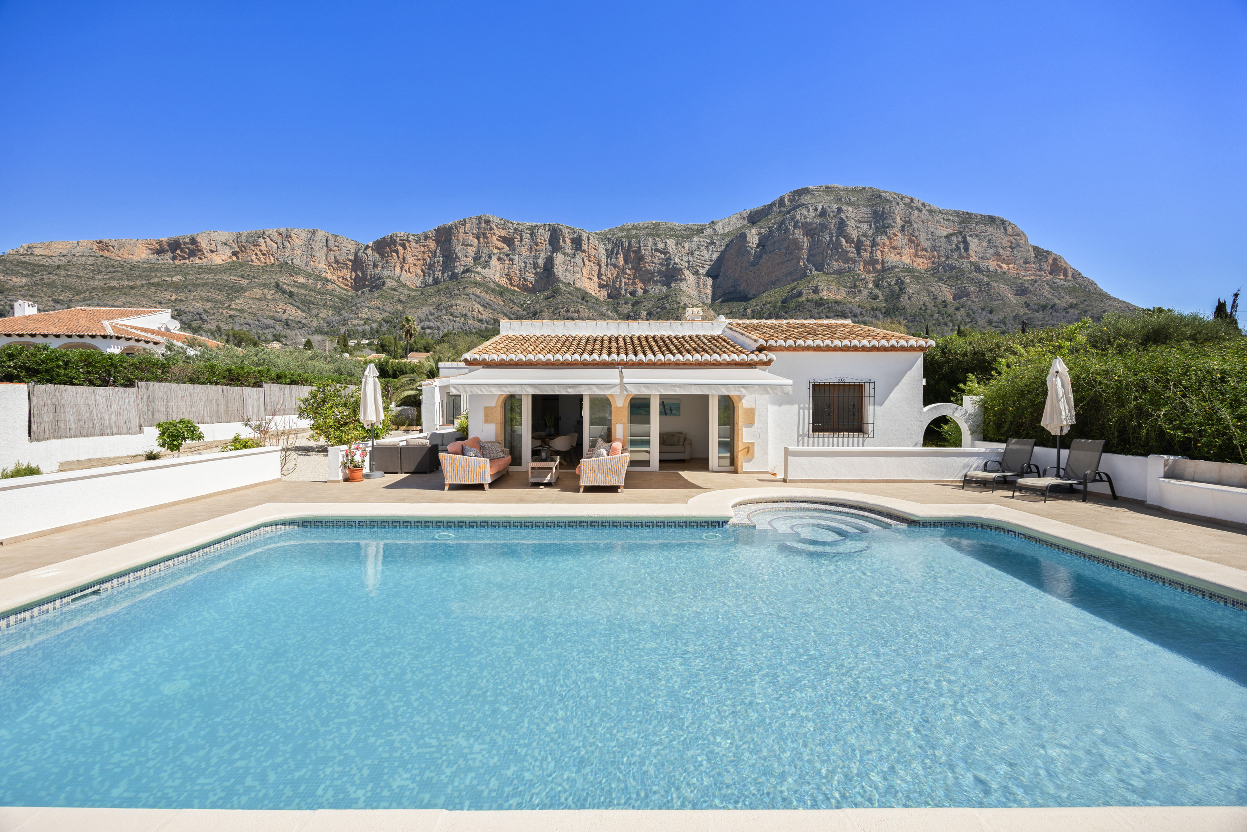 La vie en plein air occupe ici le devant de la scène. La vaste terrasse entoure une grande piscine privée et offre de multiples espaces pour se détendre, dîner et recevoir. Que vous profitiez de longs déjeuners dans la salle à manger ombragée ou de vous détendre au bord de la piscine, l’ambiance est sublimée par des vues panoramiques sur la montagne du Montgó et la campagne environnante. Une salle de bain extérieure séparée apporte plus de commodité pour la vie au bord de la piscine.